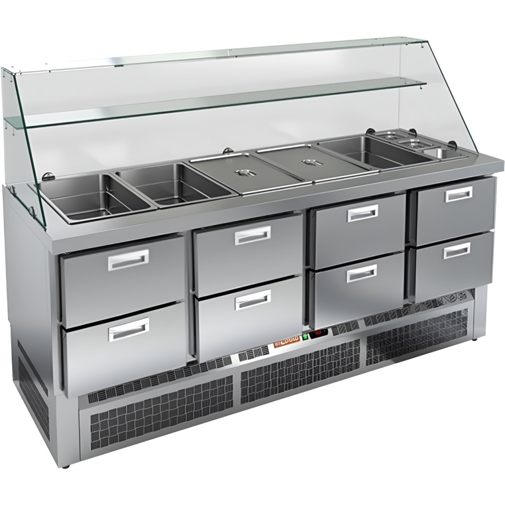 Модель обеспечивает удобный доступ к продуктам и позволяет повару работать максимально эффективно. Корпус и столешница изготовлены из нержавеющей стали, что гарантирует долговечность конструкции, устойчивость к коррозии и соответствие санитарным нормам. Дополнительным преимуществом является высокое защитное стекло, которое обеспечивает гигиеничность выкладки и удобство при обслуживании гостей.