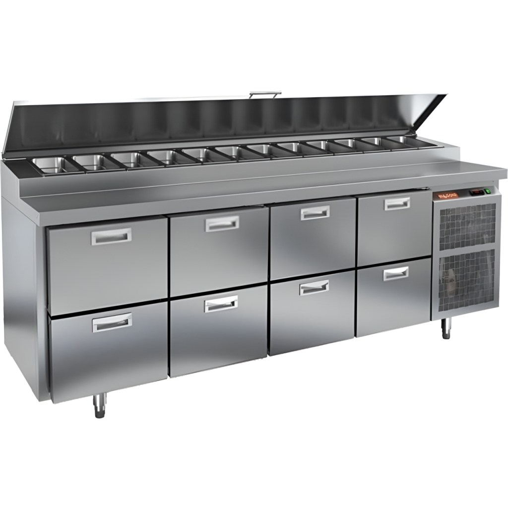 Каталог оборудования Холодильное оборудованиеСтолы охлаждаемыеСтолы холодильные для пиццыСтол холодильный для пиццы HiCold PZ1-2222GN (1/3H) Стол холодильный для пиццы HiCold PZ1-2222GN (1/3H) Код товара: 064-713 Поделиться: WhatsAppTelegram СравнитьДобавить в КПВ избранное 0 373 042 ₽ В корзину 0 шт Под заказСамовывоз сегодня бесплатно Взять в кредит Купить в лизинг Получить консультацию в WhatsApp Описание Характеристики Отзывы 0 Стол холодильный для пиццы HiCold PZ1-2222GN (1/3H) — профессиональное оборудование для предприятий общественного питания и торговли. Он сочетает рабочую поверхность для раскатки теста и подготовки ингредиентов с охлаждаемым блоком для кратковременного хранения скоропортящихся продуктов и напитков. Такое решение обеспечивает максимальное удобство — все необходимые компоненты всегда находятся под рукой. Корпус и столешница выполнены из нержавеющей стали, что гарантирует долговечность, устойчивость к повреждениям и лёгкость ухода. Основные особенности: Нержавеющая столешница и корпус — прочность, гигиеничность и лёгкость очистки Динамическая система охлаждения — равномерное распределение холода Автоматическая оттайка — стабильная работа без образования наледи Электронная панель управления — точная настройка температуры 8 выдвижных ящиков — удобная организация внутреннего пространства без дверцы Автоматические доводчики ящиков — комфорт при работе Легкозаменяемые магнитные уплотнители — поддержание герметичности Открытая агрегатная часть — лёгкий доступ для обслуживания Регулируемые по высоте ножки — установка на неровных поверхностях Максимальная глубина гастроёмкостей: 100 мм Глубина рабочей поверхности: 324 мм Толщина столешницы и теплоизоляции: 50 мм Вместимость салат-бара: до 12 гастроёмкостей Стол холодильный HiCold PZ1-2222GN (1/3H) — надёжный и функциональный холодильный стол для пиццы и салатов. Отсутствие дверцы и продуманная система хранения обеспечивают быстрый доступ к ингредиентам, удобство эксплуатации и высокую производительность на профессиональной кухне.Изображение товара, представленного на фото, может отличаться от его фактического вида. Показать все Габаритные размеры2280×700×1000 ммДиапазон рабочей температурыот +2 до +10 °CРасположение агрегатаБоковое Материал столешницыНержавеющая Тип столаС ящиками Объём660 лТип гастроемкостейGN 1/3 Количество ящиков8 штНапряжение220 ВМощность0,5 кВтТип охлажденияДинамическое Тип оттайкиАвтоматическая Габариты в упаковке2420×850×1080 ммВес нетто170 кгВес брутто236 кгБрендHicoldВсе холодильные столы для пиццы HicoldВсе нержавеющие холодильные столы для пиццы Оставить отзыв Еще никто не оставил отзыв на этот товар Ранее просмотрено Цена по запросу Витрина морозильная Иней LIDA KUB M 3,75 Под заказ 253 252 ₽ Стол холодильный для пиццы HiCold PZ3-12/GN камень Под заказ 224 182 ₽ Стол холодильный для пиццы HiCold PZ2-111GN (1/6) стекло Под заказ 191 782 ₽ Стол холодильный для пиццы HiCold PZE2-111/GN (1/6H) З