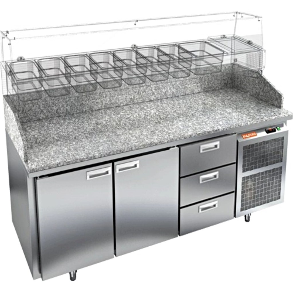 Каталог оборудования Холодильное оборудованиеСтолы охлаждаемыеСтолы холодильные для пиццыСтол холодильный для пиццы HiCold PZ3-113/GN камень Стол холодильный для пиццы HiCold PZ3-113/GN камень Код товара: 065-007 Поделиться: WhatsAppTelegram СравнитьДобавить в КПВ избранное 0 312 652 ₽ В корзину 0 шт Под заказСамовывоз сегодня бесплатно Взять в кредит Купить в лизинг Получить консультацию в WhatsApp Описание Характеристики Отзывы 0 Стол холодильный для пиццы HiCold PZE3-113/GN камень предназначен для использования в пиццериях, кафе, магазинах и ресторанах. Он идеально подходит для раскатки теста, подготовки ингредиентов и кратковременного хранения скоропортящихся продуктов. Витрина приобретается отдельно. Стол сочетает корпус из нержавеющей стали и гранитную столешницу, которая устойчива к механическим и температурным нагрузкам и удобна в работе с тестом. Такая конструкция обеспечивает долговечность, гигиеничность и простоту ухода. Особенности модели: Охлаждение: динамическое — равномерное поддержание температуры Оттайка: автоматическая — удобство и экономия времени Панель управления: электронная — точная настройка температуры Ножки: регулируемые по высоте — устойчивость на неровной поверхности Двери: 2 глухие двери с автоматическими доводчиками и фиксатором открытого положения Ящики: 3 выдвижных ящика — удобное хранение ингредиентов Уплотнители: легкозаменяемые магнитные — герметичность и простота обслуживания Толщина теплоизоляции: 50 мм — сохранение холода и энергоэффективность Рабочая поверхность: глубина 680 мм — удобство работы HiCold PZE3-113/GN камень— это надёжный и функциональный холодильный стол для пиццы, который сочетает прочность, эргономику и эффективное охлаждение. Благодаря гранитной столешнице, корпусу из нержавеющей стали, двум глухим дверям и двум выдвижным ящикам он станет универсальным решением для профессиональной кухни. Изображение товара, представленного на фото, может отличаться от его фактического вида. Показать все Габаритные размеры1835×700×1050 ммДиапазон рабочей температурыот +2 до +10 °CРасположение агрегатаБоковое Материал столешницыГранитная Тип столаС дверьми и ящиками Тип двериГлухая Объём505 лКоличество дверей2 штКоличество ящиков3 штРазмер полки530×325 ммНапряжение220 ВМощность0,5 кВтТип охлажденияДинамическое Тип оттайкиАвтоматическая Габариты в упаковке2000×850×1180 ммВес нетто172 кгВес брутто192 кгБрендHicoldВсе холодильные столы для пиццы HicoldВсе нержавеющие холодильные столы для пиццы Оставить отзыв Еще никто не оставил отзыв на этот товар Ранее просмотрено Под заказ 191 782 ₽ Стол холодильный для пиццы HiCold PZE2-111/GN (1/6H) З